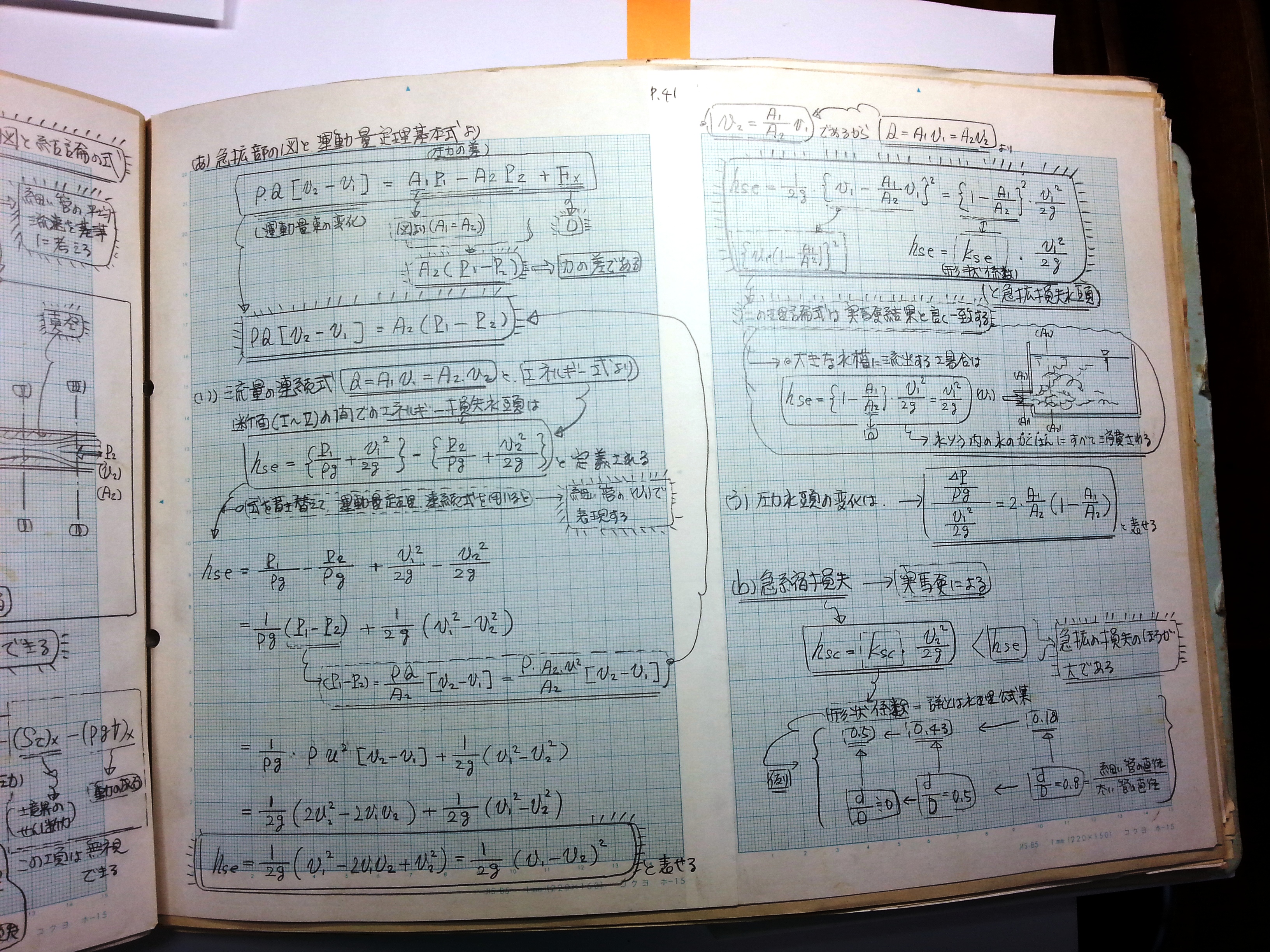 運動量定理基本式、流量の連続式、圧力水頭の変化、急拡損失