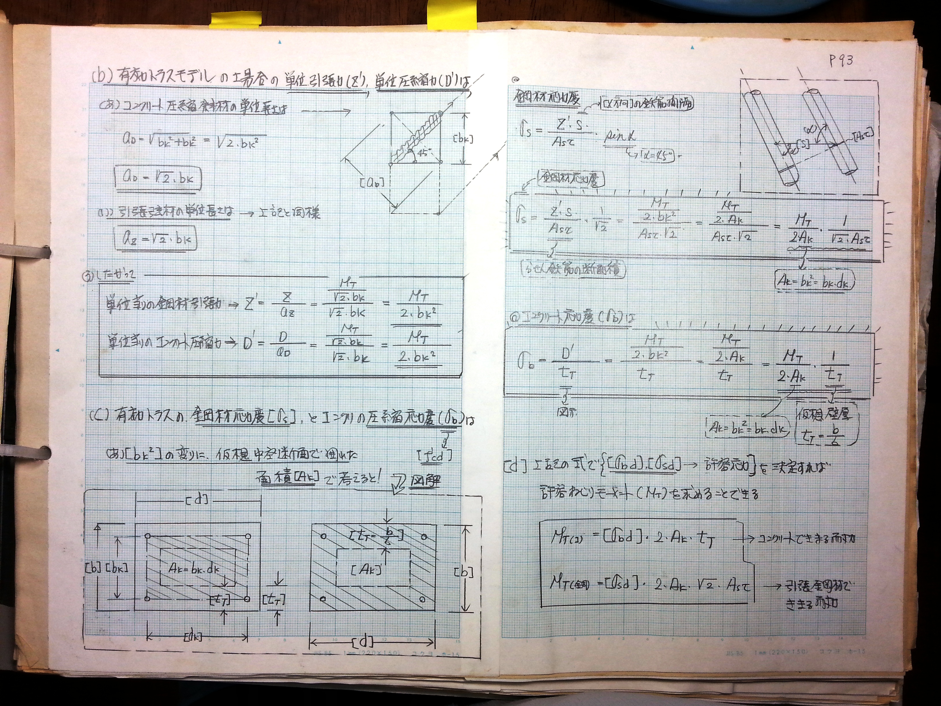 (b)有効トラスモデルの場合の単位引張力、単位圧縮力は