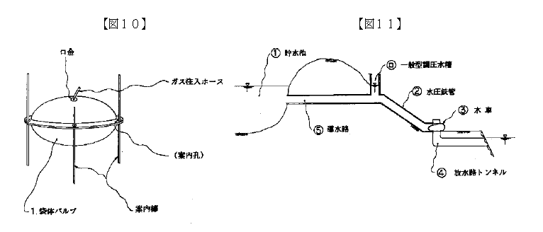 (ホ) 発電出力急増中の急遮断の場合には、袋体バルブ1は、制水口止水弁座11に着座していることもあるが、この状態は、通常の発電運転では発生しないと考えられる。なお、袋体バルブ1が着座していても、袋体バルブ1の構造上より水撃圧力は、袋体バルブ1を通り空気室4で発散するか、袋体で吸収できる。その理由は、袋体バルブ1には、圧縮ガス(例;空気)が密閉もしくは充満していることによって、圧力容器内の空気室4と同じ機能をすることによる。