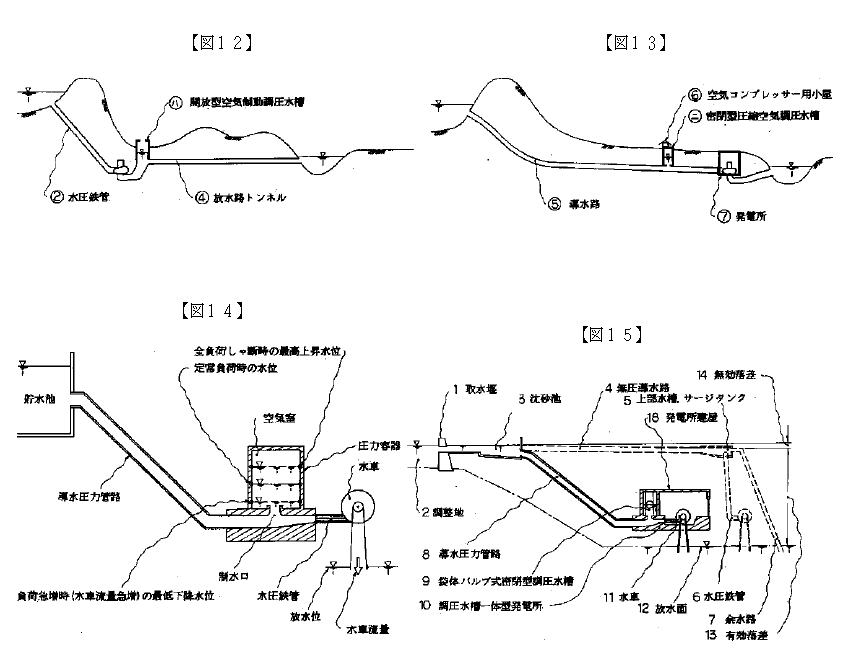 (ニ) 従来の水路式中小水力発電(図15参照)では、取水堰1から発電所の直上部に設置する上部水槽5(サージタンク)に至る間に、1/1000程度の勾配をもって無圧導水路4を開渠、あるいはトンネル等の工法によって布設する。さらに、上部水槽5の越流水を放流する余水路7を設け、上部水槽5から直下の水車までの間に水圧鉄管6を設けて、流水を導く方法で水路を布設していた。したがって、上部水槽5の水位と放水面12との水位の間で所要の落差を得ていた。この場合、沈砂池3の水位と上部水槽5との間に、発電に寄与しない無効落差14を生じて有効落差13を減少させて、発電出力と発生電力量を減少させてきた。また、農業用水等のように、季節的に生ずる用水を無圧導水路4より補給し、使用しない場合には発電流量補給に用いて発電量増加をするという積極的な計画発想も少なかった。(図17参照~水資源の合理的利用)