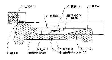 堤体背面側方取水堰において、水たたき3の上部に流線形バッフルピア4を設け、その頂部に翼形シル1を取り付けて、スロット5を構成します。さらに、副ダム2の沈砂池7側に排砂ゲート8を設置します。