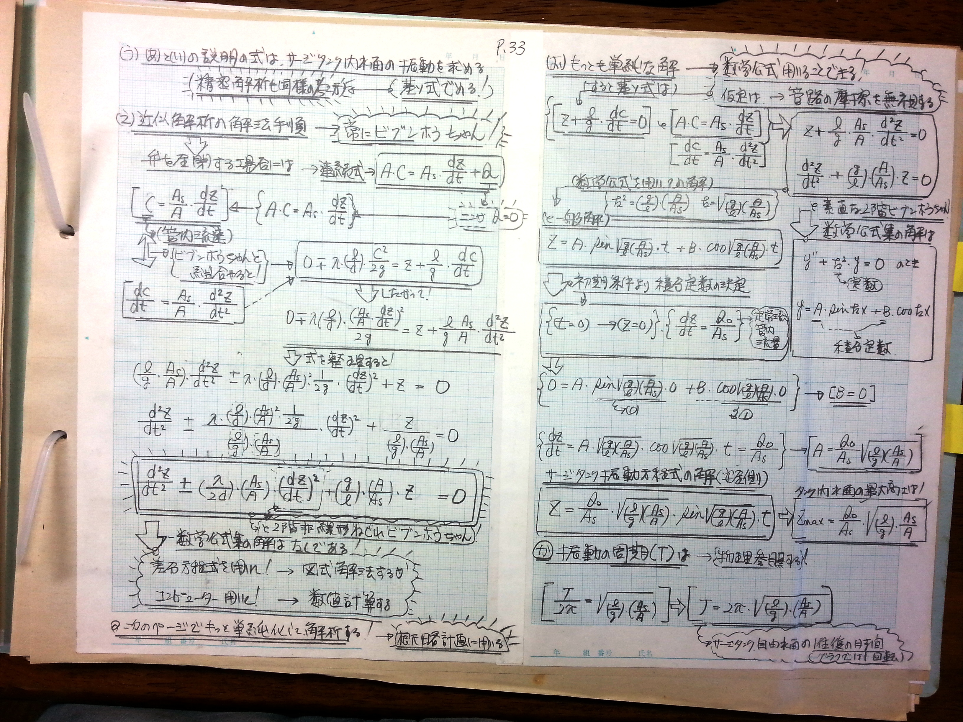 (う)(あ)と(い)の説明の式は、サージタンク内水面の振動を求める
