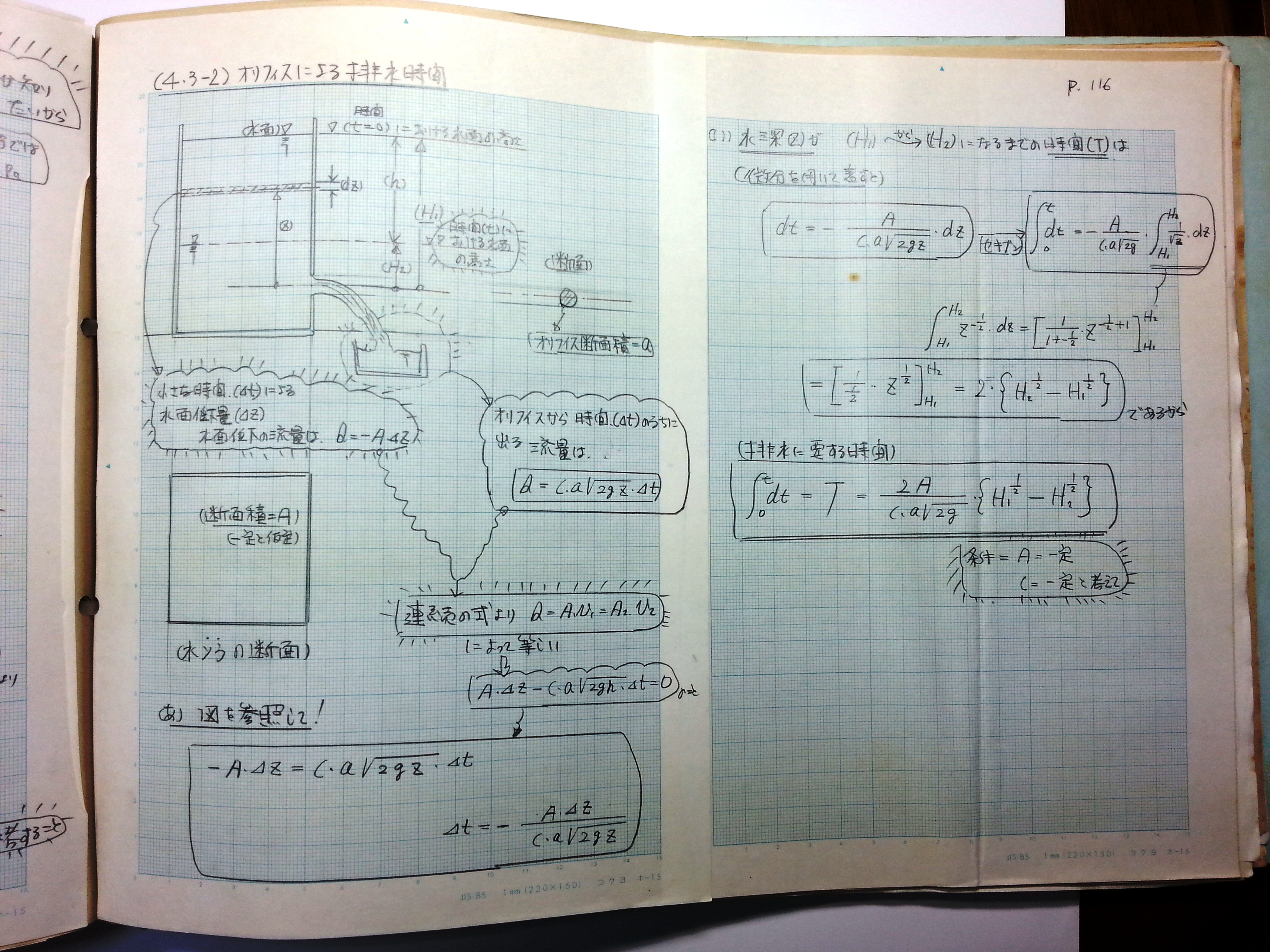 小さな時間による水面低下の流量と、オリフィスから小さな時間のうちに出る流量は、連続の式により等しい