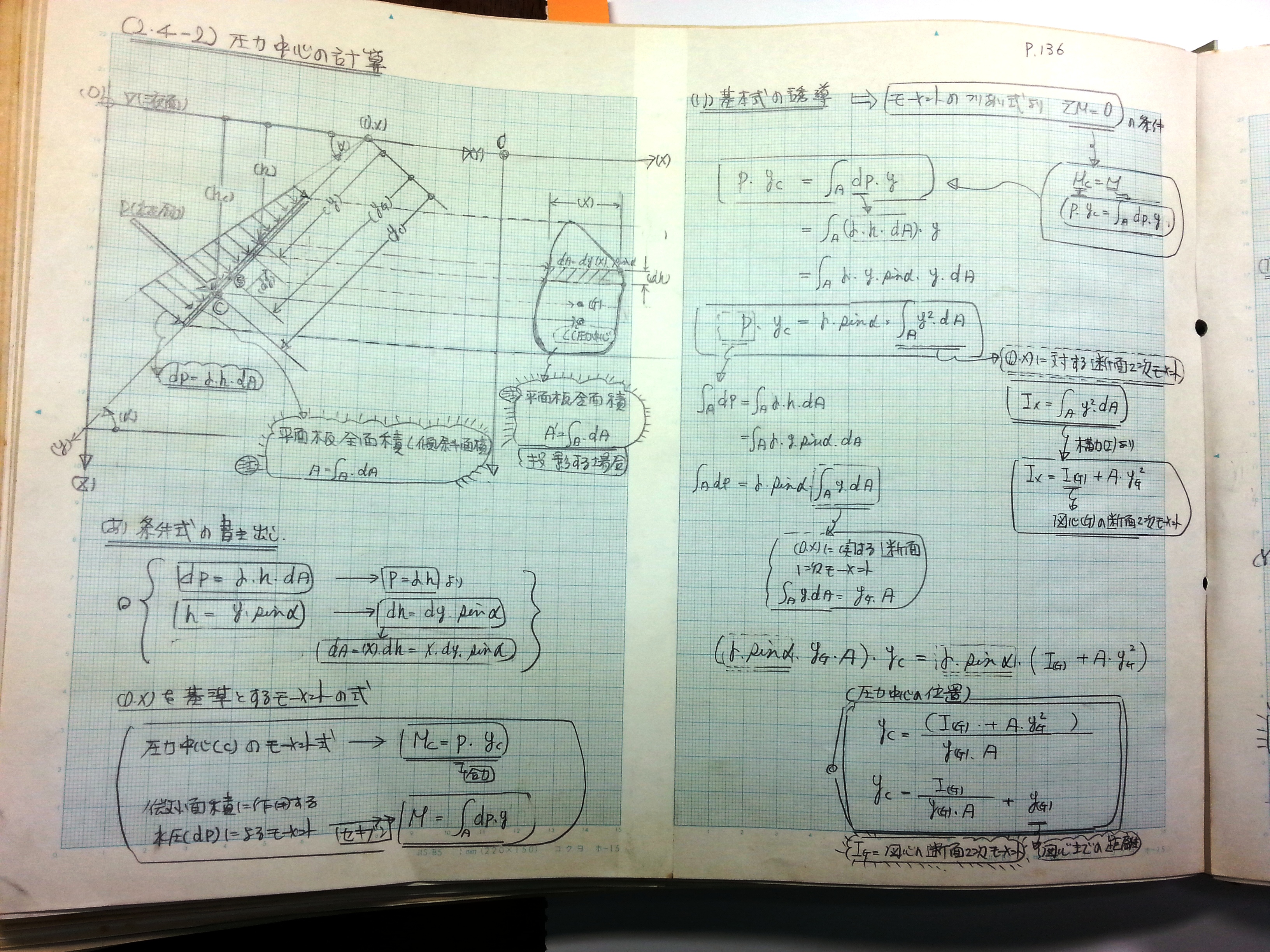 圧力中心の計算 平面版全面積(傾斜面積) 条件式の書出し 基本式の誘導 水理学基礎 P101~P146に戻る 上の画像をクリックしますと、画像が大きくなります。その画像をクリックしますと、さらに大きくなります。